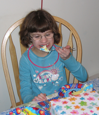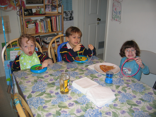 Chris, Ben, and Lindsay having a pizza party, complete with glow-in-the-dark necklaces! |